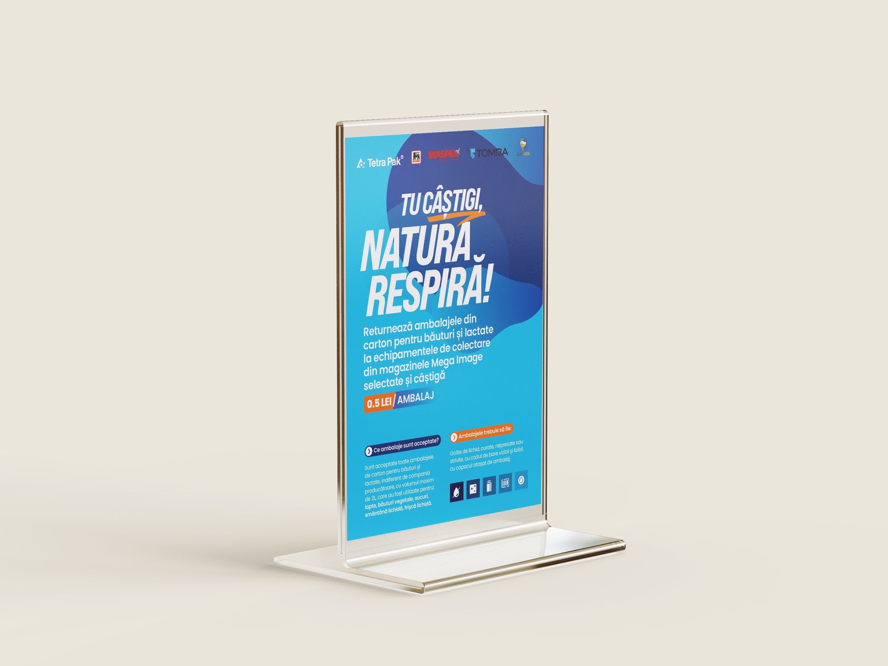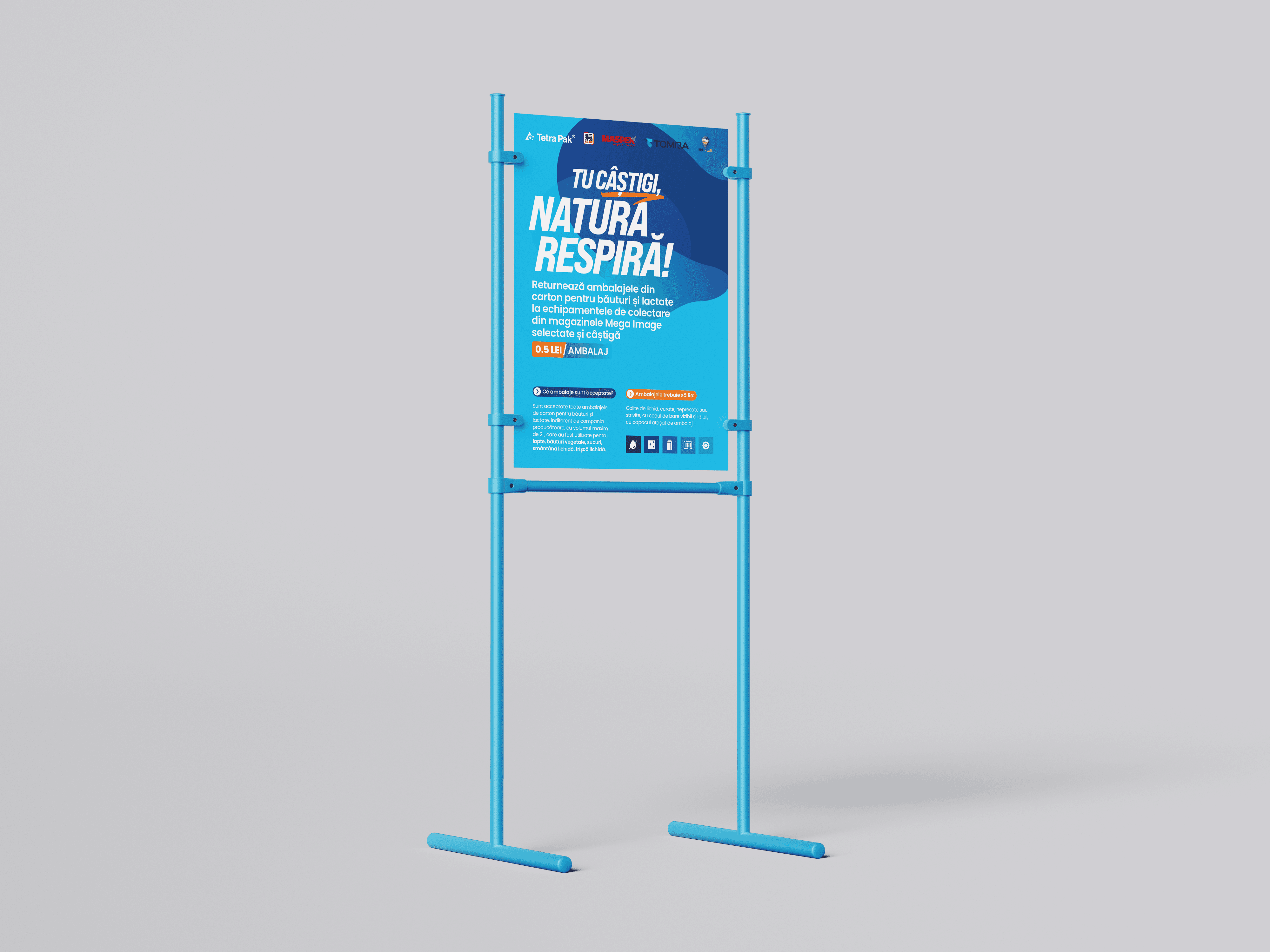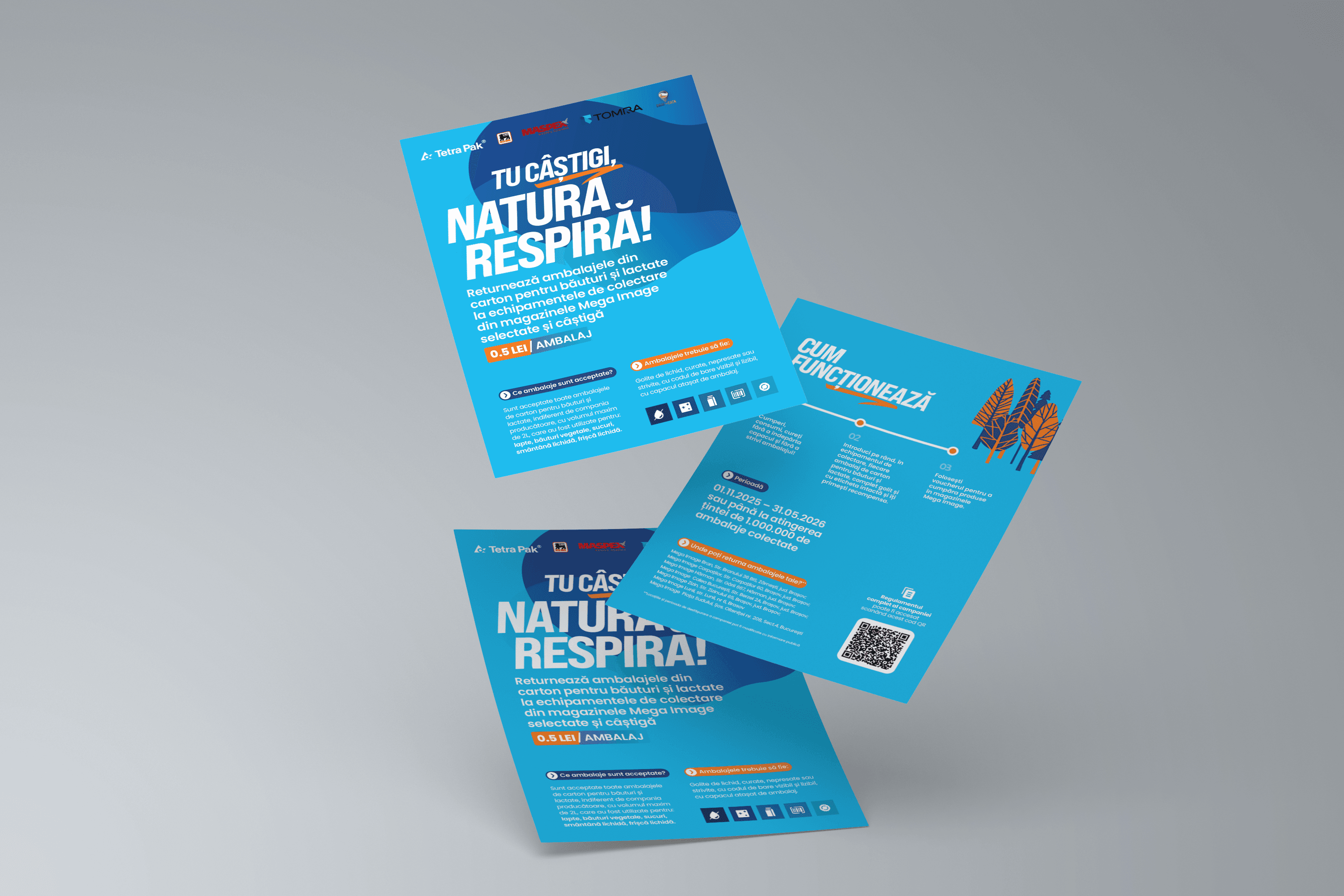 This local campaign encouraged consumers to return used Tetra Pak cartons for recycling through a clear, optimistic visual identity. The design system was applied across print, digital, and on-site materials, from posters and flyers to machine wraps and outdoor stands, ensuring message consistency across every touchpoint.